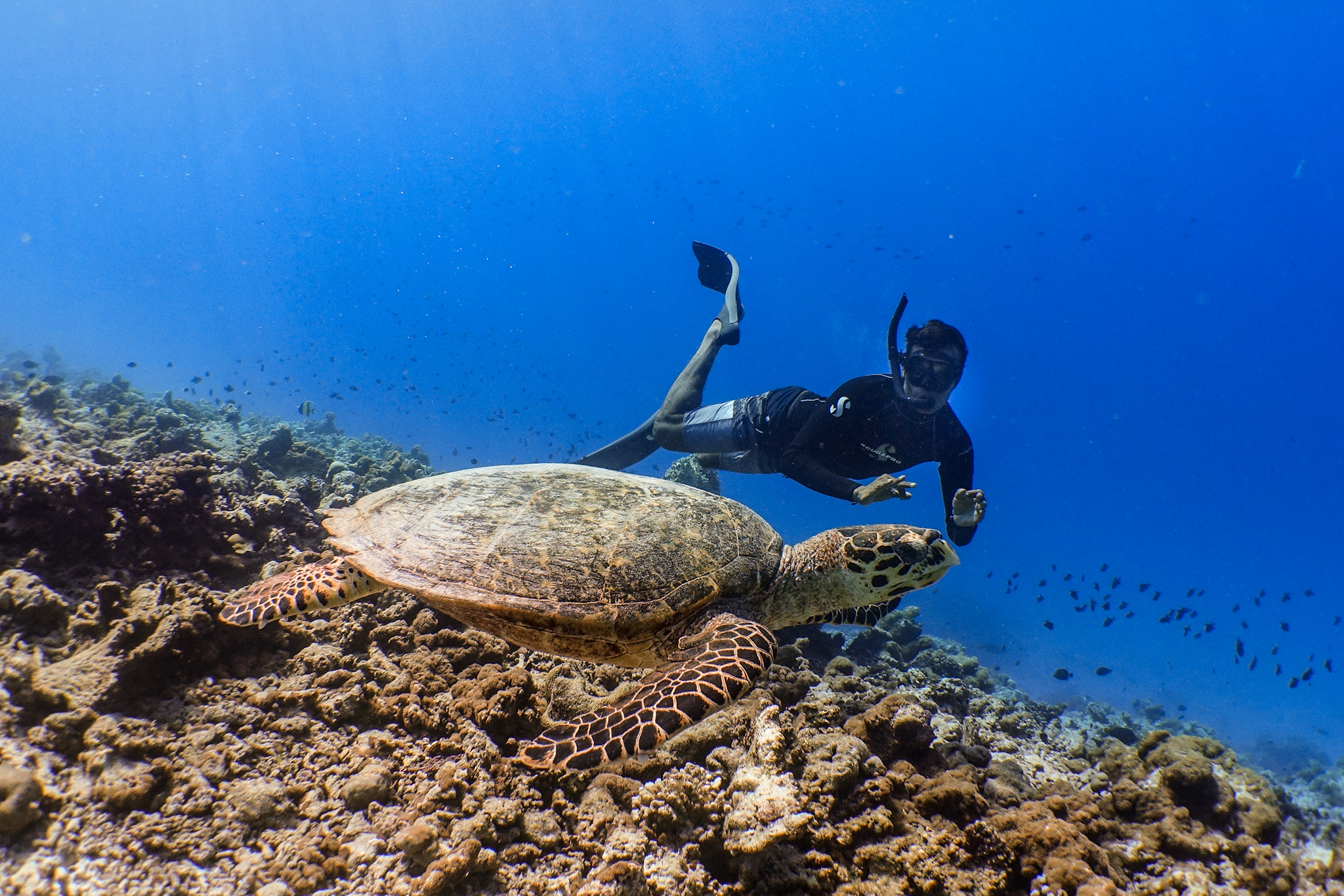What to expect: Tropical reef fish, reef sharks, eagle rays, sea turtles, moray eels, octopus, varieties of hard and soft corals and seasonal sightings of manta rays in the surrounding lagoon.